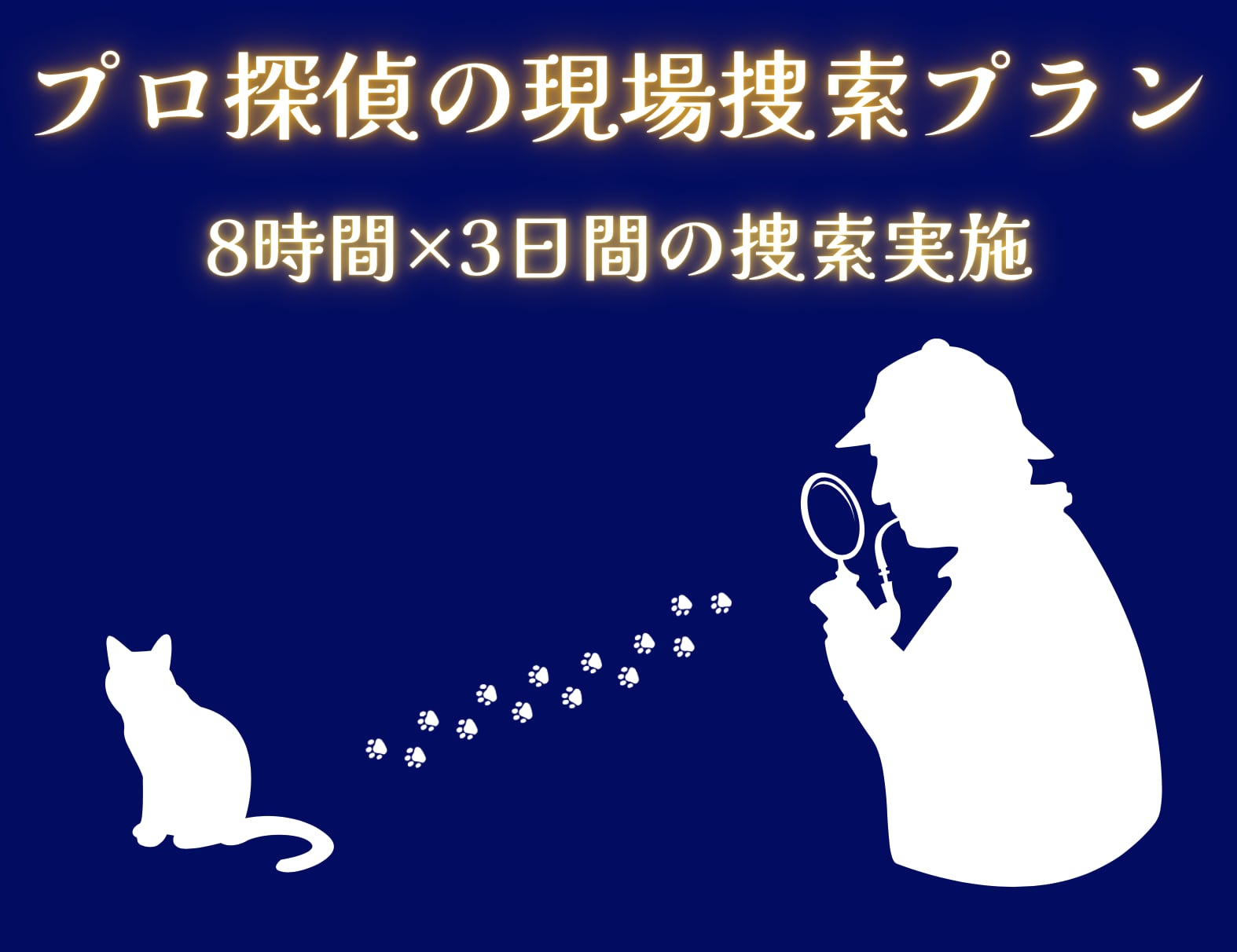 弊社の研修を受け、ネコの行動心理学を深く学んだプロフェッショナルな捜索員が貴方の元に駆けつけ、迷子ネコ探しを「3日間×8時間」貴方と共に協力いたします。